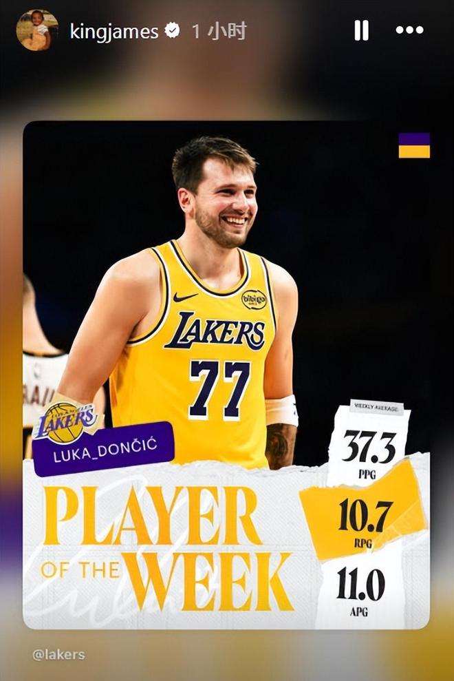 就在早些時候,東契奇當選西部周最佳球員,幫助湖人先后擊敗森林狼、公牛和掘金。他場均出戰(zhàn)38.3分鐘,得到37.3分,投籃命中率46.9%,三分命中率42.5%,罰球命中率79.2%,同時貢獻10.7個籃板、11.0次助攻、2.0次搶斷和1.7次蓋帽。這位27歲的球星在這三場比賽中砍下兩次三雙、一次兩雙,并貢獻了他加盟湖人后的首個50+得分表演。詹姆斯也第一時間為隊友送上祝賀。