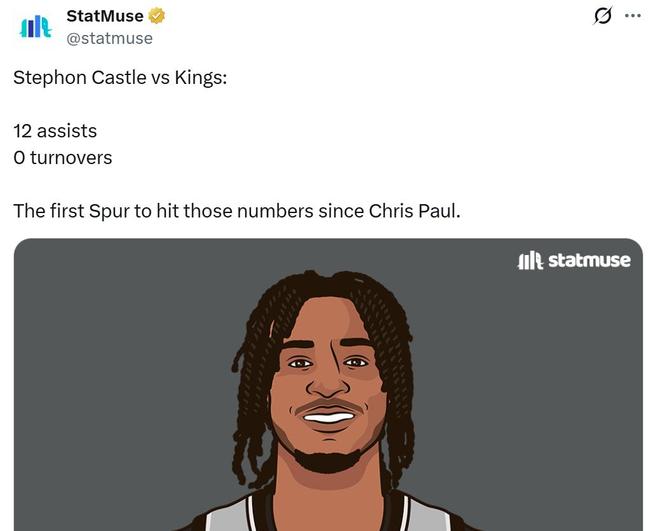7名得分上雙的球員中還不包括卡斯爾,本場他7中1失準,但狂送12次助攻并且一次失誤都沒有,憑借這樣的表現(xiàn),卡斯爾成為保羅之后馬刺首位單場做到12助0失誤的球員。