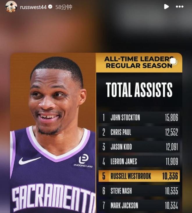 憑借這樣的表現(xiàn),威少生涯總助攻數(shù)成功超越馬克-杰克遜和納什升至NBA歷史第五,賽后威少本人也轉(zhuǎn)發(fā)多條動態(tài)慶祝。