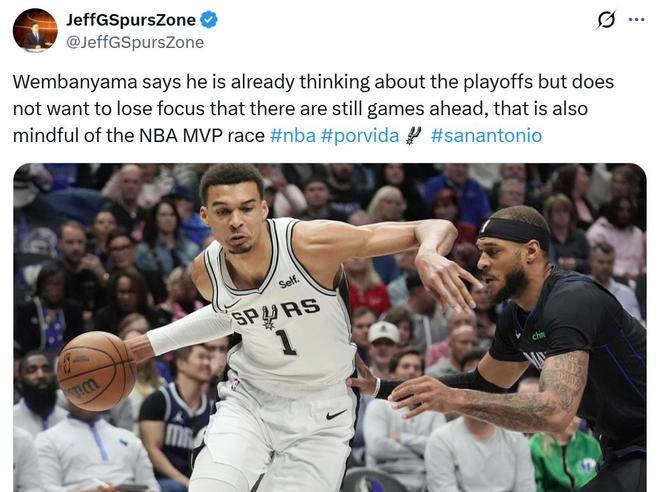 賽后文班亞馬就公開表示自己已經(jīng)開始考慮季后賽了,但他不想因此而分心,畢竟還有比賽要打,同時自己也很關(guān)心MVP的歸屬。