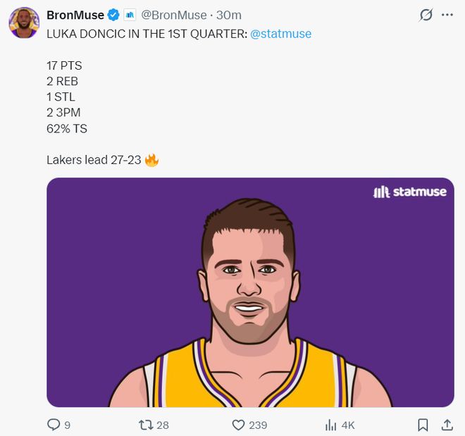 首節(jié)東契奇居然為了球權(quán)飛撲到場(chǎng)外,也是這次飛撲導(dǎo)致他的腿部不適下場(chǎng)處理,但他首節(jié)11中5+三分7中2拿到17分2籃板1搶斷,他一人支撐了湖人的進(jìn)攻,湖人全隊(duì)首節(jié)只拿27分而已。