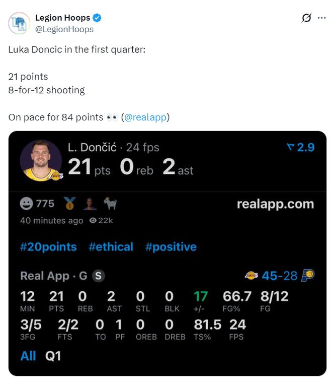 東契奇首節(jié)的手感非常好,尤其是他外線開了后就防不住了,單節(jié)12分鐘,12中8,三分5中3,罰球2中2,拿到21分2助攻,命中率66.7%,三分命中率60%,真實(shí)命中率81.5%,正負(fù)值+17。