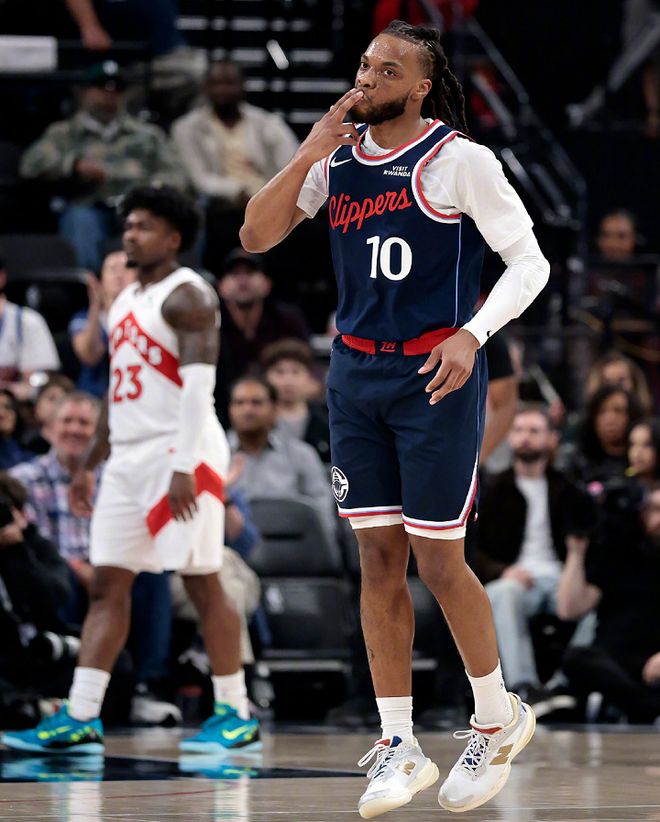 重新回到賽場(chǎng)之后,并沒有放棄的猛龍,開始在防守端死掐萊昂納德,面對(duì)針對(duì)性十足的防守,萊昂納德后兩節(jié)的得分效率出現(xiàn)了一定的下滑,但四節(jié)戰(zhàn)罷還是靠著19次出手命中9球的發(fā)揮,貢獻(xiàn)了27分、6個(gè)籃板、2次助攻和1個(gè)封蓋的不俗表現(xiàn),其中連續(xù)49場(chǎng)得分20+,繼續(xù)刷新自己生涯和快船隊(duì)史紀(jì)錄。