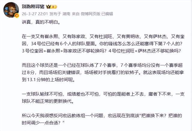 別跑剛被豬老師是這樣說(shuō)的:一支球隊(duì)輸球不可怕,成績(jī)差也不可怕,可怕的是能者上不去,庸者下不來(lái),一支球隊(duì)不能正常的更新?lián)Q代。所以今天我很想反問(wèn)宏遠(yuǎn)教練組一個(gè)問(wèn)題,宏遠(yuǎn)現(xiàn)在到底該“把誰(shuí)換下來(lái)?把誰(shuí)的時(shí)間調(diào)少一點(diǎn)合適?”