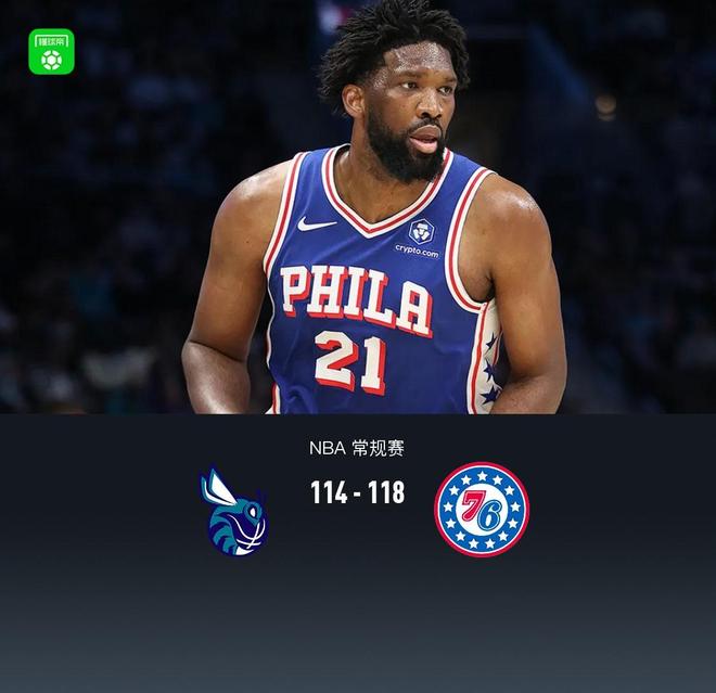北京時間3月29日NBA 常規(guī)賽,夏洛特黃蜂對陣費城76人。本場76人馬克西復出與恩比德、喬治一同出戰(zhàn)。首節(jié)黃蜂領先11分,半場黃蜂69-64領先76人,第三節(jié)黃蜂仍領先5分,末節(jié)76人迅速追上比分,隨后雙方持續(xù)拉鋸緊咬比分,最終76人118-114逆轉黃蜂。