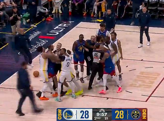 次節(jié)開場(chǎng)布朗超遠(yuǎn)三分命中,布朗拋投再中幫助掘金扳平,隨后小佩頓、梅爾頓、克萊爾、納吉、哈達(dá)威、穆雷等人爆發(fā)沖突,裁判給了納吉、佩頓、梅爾頓三人T,穆雷技術(shù)犯規(guī)罰球命中反超了,小哈達(dá)威三分命中,掘金退防太慢勇士連續(xù)反擊再度反超。掘金的防守突然就崩潰了勇士一度拉開13分,約基奇連續(xù)發(fā)力縮小到7分結(jié)束上半場(chǎng)。
