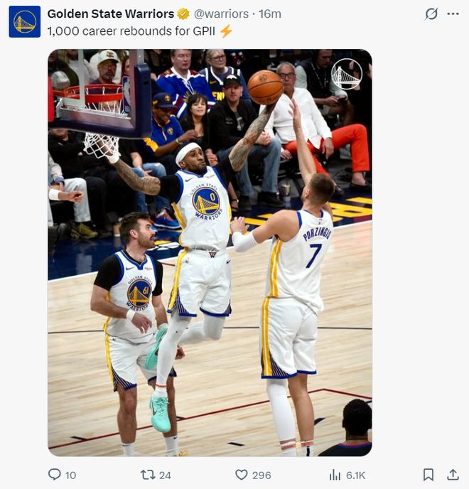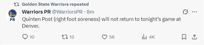 勇士官方:波斯特因?yàn)橛夷_酸痛本場(chǎng)比賽不會(huì)回歸。