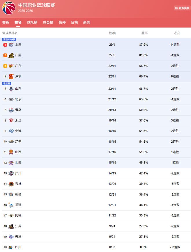 聯(lián)賽第1的位置目前也沒有確定,上海隊29勝4負,廣廈隊27勝6負,2隊之間的勝負差只有2場,誰能拿下第1還真不好說,不過上海隊可能更大!