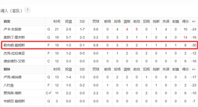詹姆斯第三節(jié)4中2拿到5分3籃板,末節(jié)因為分差太大他直接作壁上觀了,全場比賽26分鐘,7中3+三分4中1,罰球8中6,拿到13分6籃板2助攻1搶斷1蓋帽,命中率42.9%,三分命中率25%,真實命中率61.8%,正負(fù)值-37。