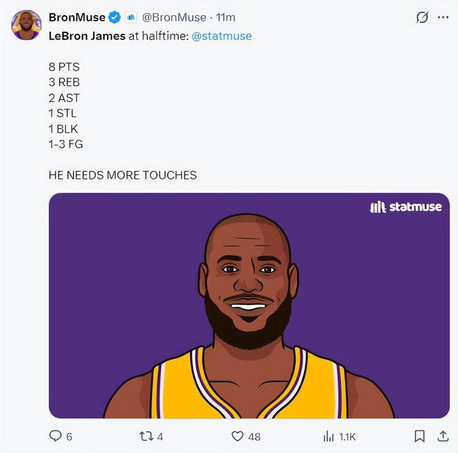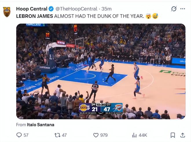 開場湖人就被雷霆打垮了,里夫斯個人4次失誤讓湖人開場崩盤,詹姆斯開場防守端已經(jīng)非常積極只可惜全隊拉胯,第二節(jié)詹姆斯險些完成隔扣2+1,只可惜被犯規(guī)沒能扣進。