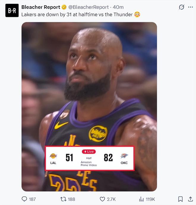 但上半場打完詹姆斯在場-30湖人最差,東契奇在場-24,八村壘在場-23,這讓黑子們各種炮轟老頭子。在半場結(jié)束時詹姆斯進入球員更衣室也是低著頭,他非常沮喪。半場讓雷霆拿82分實在是太慘。