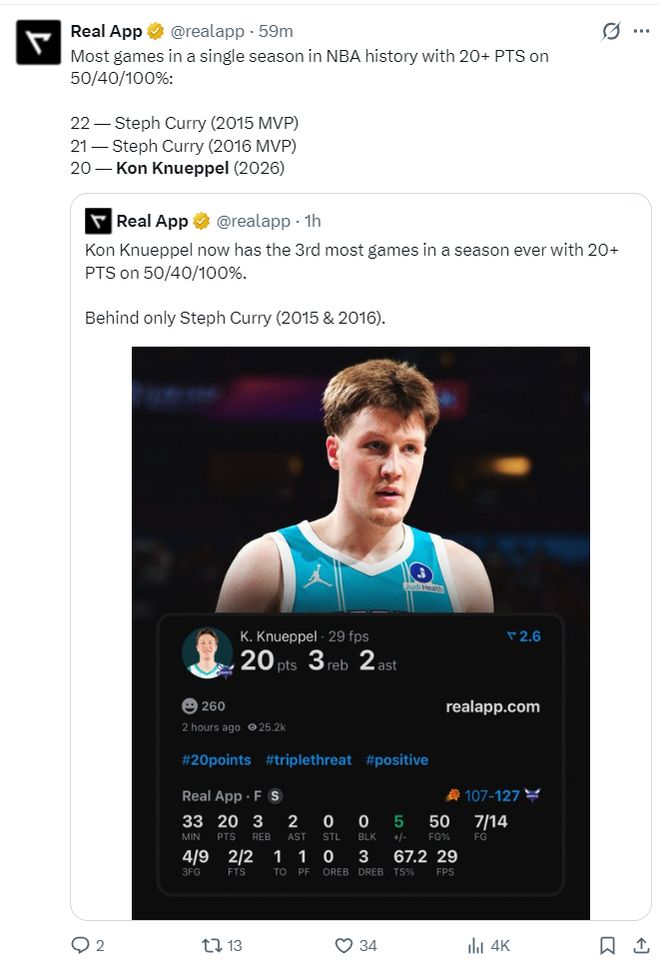 5.克努佩爾第20場(chǎng)達(dá)到20分+命中率50%+三分命中率40%+罰球命中率100%的場(chǎng)次排歷史第三,僅次于2016年的庫(kù)里與2015年的庫(kù)里,要知道克努佩爾是新秀,而庫(kù)里已經(jīng)是進(jìn)入巔峰的他。
