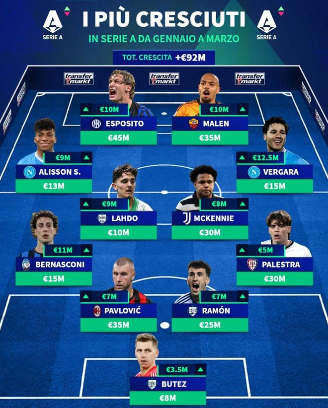 北京時(shí)間3月29日,在更新了意甲球員的身價(jià)之后,德轉(zhuǎn)列出了此次更新身價(jià)上漲最佳11人陣容,皮奧-埃斯波西托領(lǐng)銜,馬倫、麥肯尼、帕夫洛維奇在列。