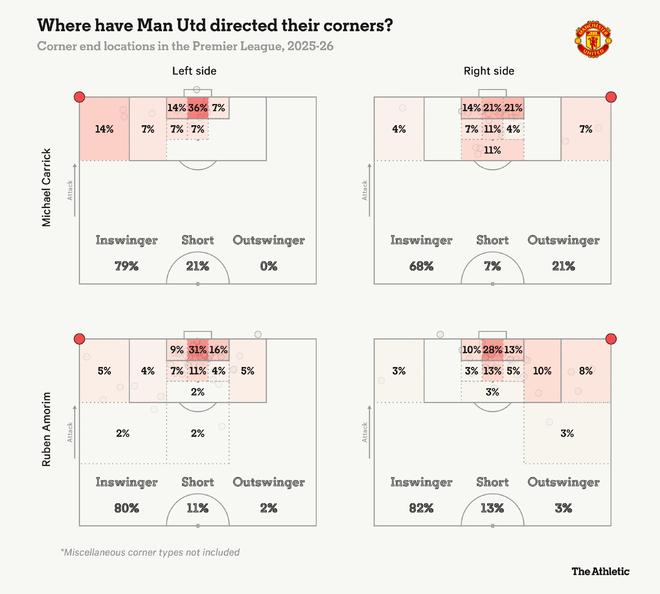 不過,教練組的更迭也帶來了角球戰(zhàn)術(shù)的變化——重新啟用外旋角球。此前,費(fèi)爾南德斯和姆伯莫分別負(fù)責(zé)左右路角球,幾乎不會切換,而卡里克時(shí)期,費(fèi)爾南德斯有時(shí)也會負(fù)責(zé)右路角球,增加了戰(zhàn)術(shù)變化性。