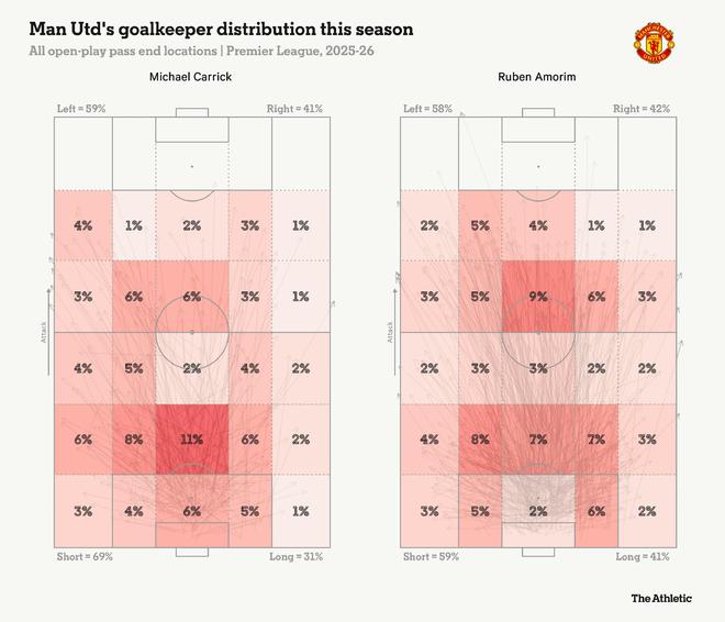 更令人鼓舞的是,更多傳球集中在對手半場。在進(jìn)攻三區(qū),曼聯(lián)的場均完成傳球數(shù)從阿莫林時(shí)期的77.2次,提升至卡里克執(zhí)教后的90.2次。